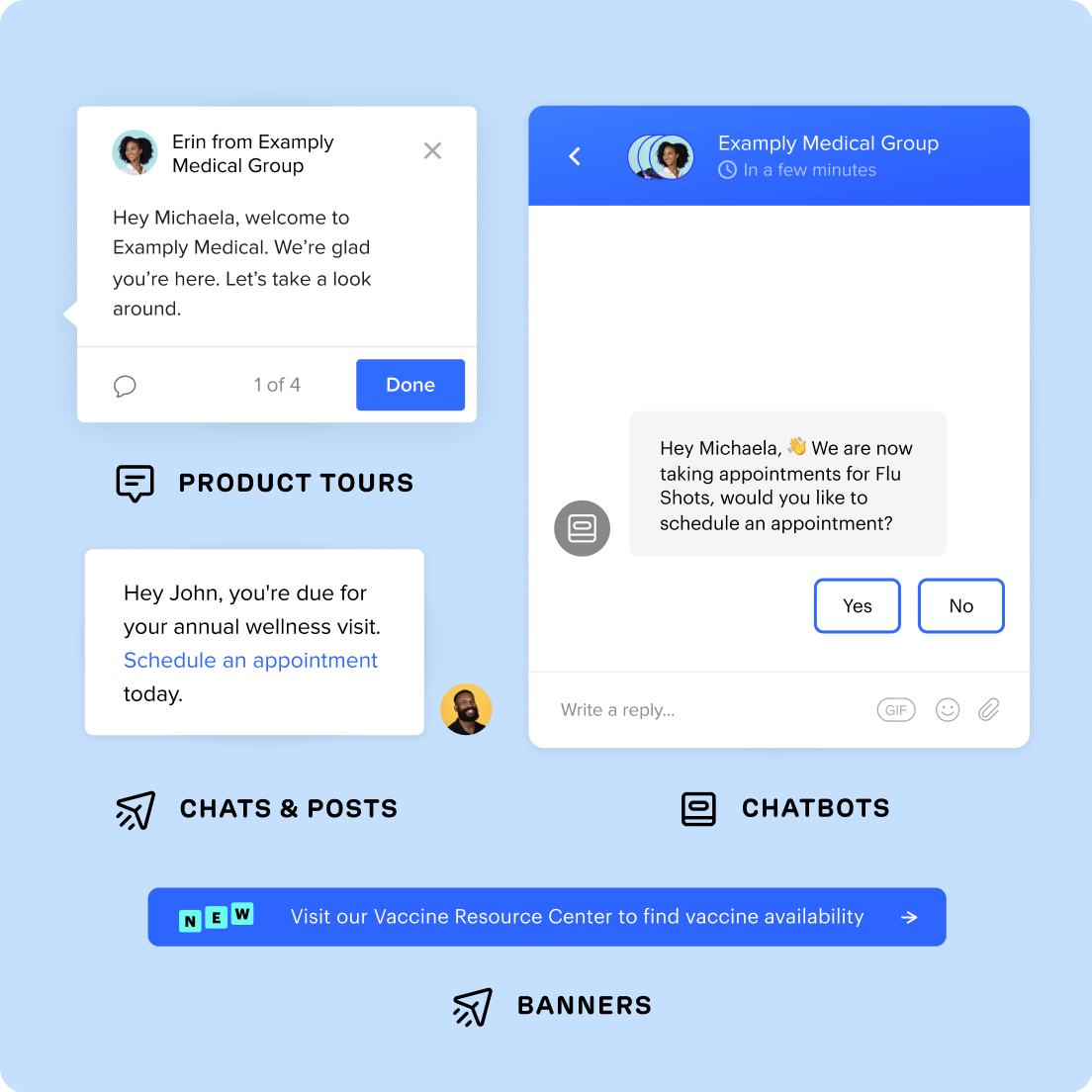 Send patients personalized in-app, SMS, email, or push messages for appointments and prescriptions—or use banners for general updates.