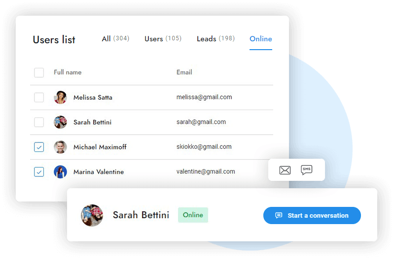 Send direct chat messages, emails, and text messages to users in real-time. Use custom merge fields to personalize every message and automatically send notifications.